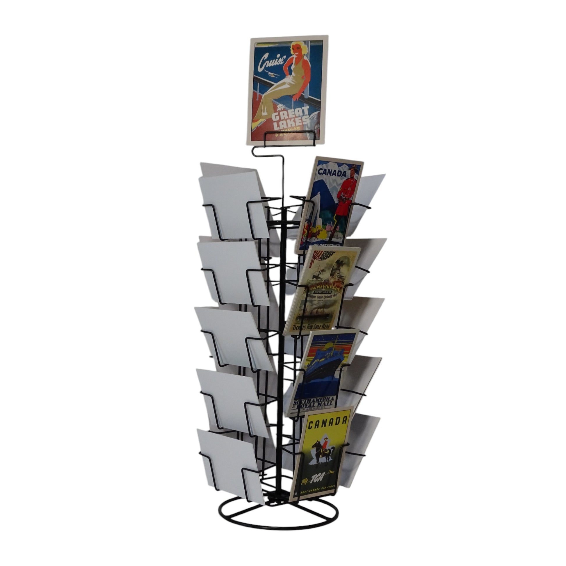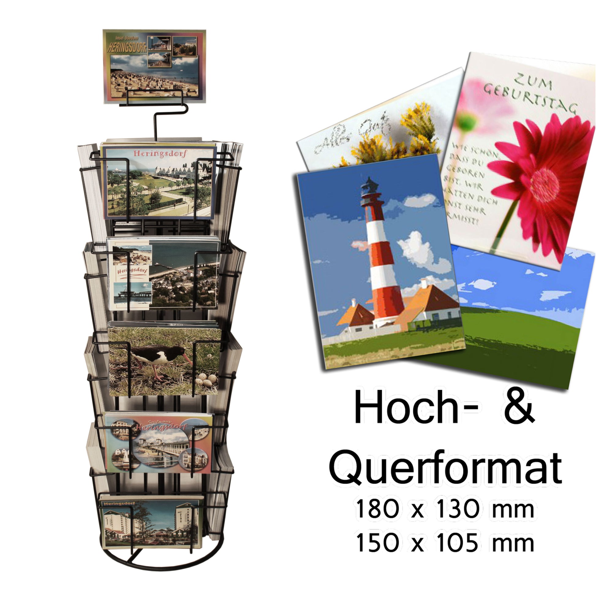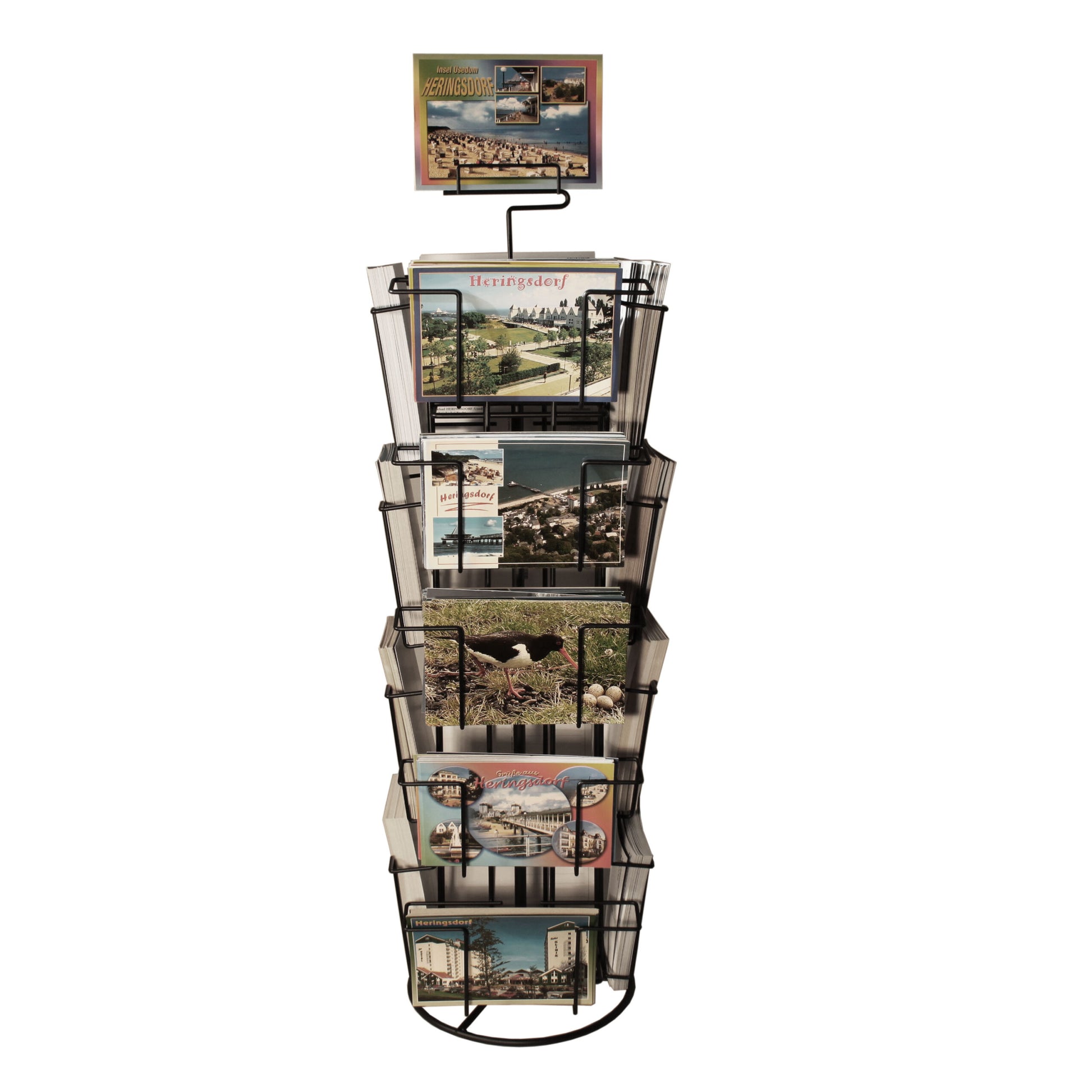 Praktischer Theken-Kartenständer zur direkten Präsentation Ihrer Motive am Point of Sale. Der Ständer überzeugt durch eine widerstandsfähige, langlebige Pulverbeschichtung in Schwarz und ist dank Kugellager leicht drehbar. Mit verschiedenen Fächern für Karten in A6 und 130 × 180 mm bietet er eine flexible Lösung für Ihre Verkaufsfläche. Ein Topschildhalter ist im Lieferumfang enthalten.