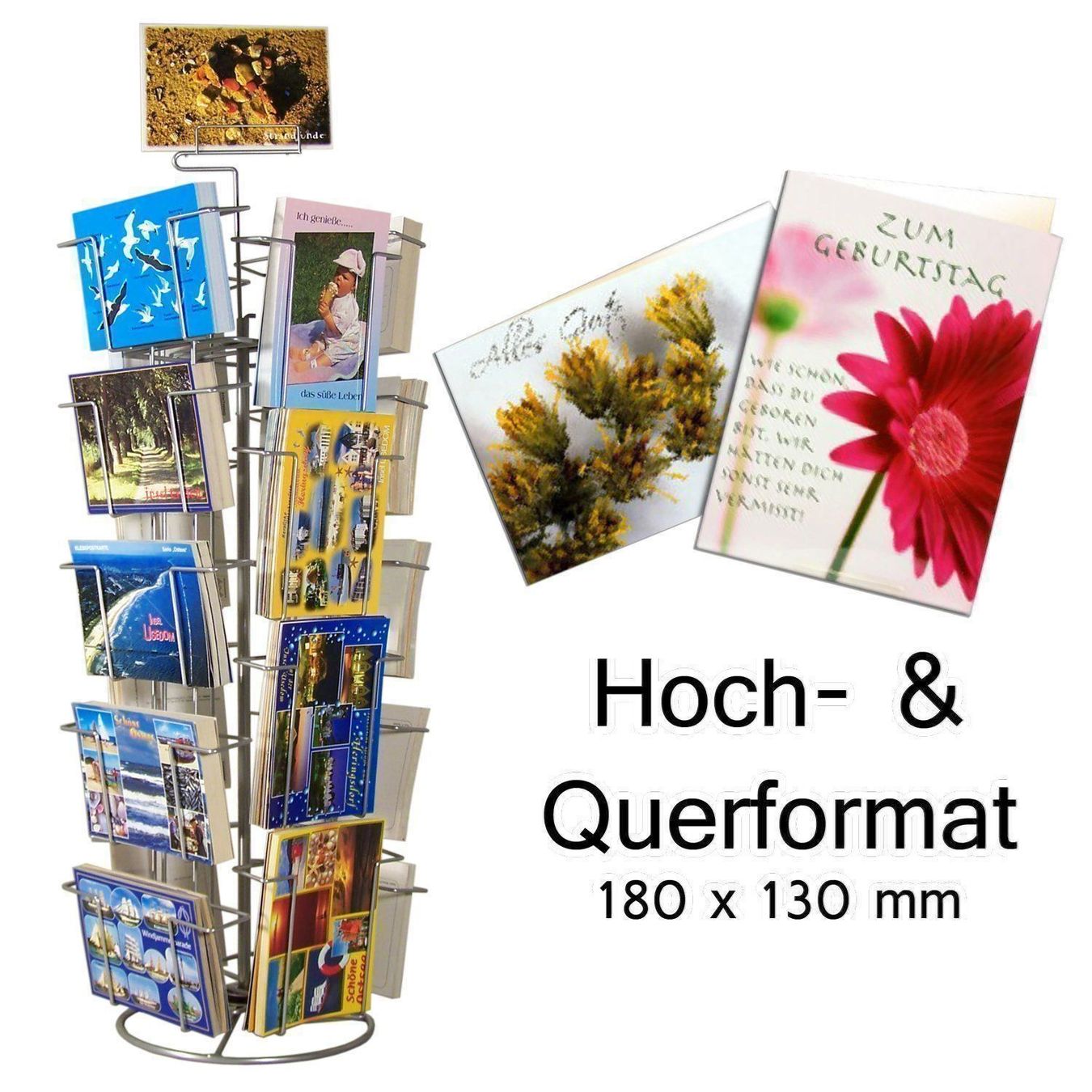 Der kompakte Kartenständer (Art. Nr. 300 500-18G) eignet sich ideal zur Präsentation von Postkarten im Format 130 × 180 mm. Mit insgesamt 18 Fächern – davon 10 im Quer- und 8 im Hochformat – bietet er ausreichend Platz für eine abwechslungsreiche Kartenpräsentation.