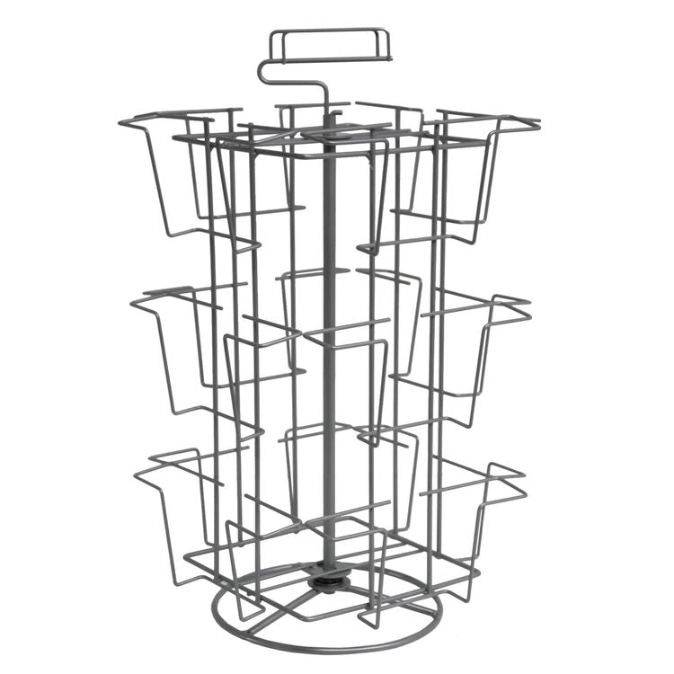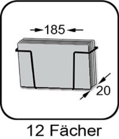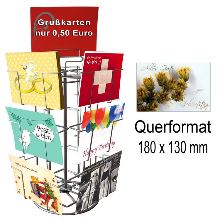 Der Kartenständer verfügt über 12 Fächer im Querformat, ideal für Postkarten im Format 130 x 180 mm. Im Lieferumfang enthalten ist ein praktischer Topschildhalter für individuelle Werbebotschaften oder Preisangaben. Die pulverbeschichtete Oberfläche garantiert eine langlebige und edle Optik.